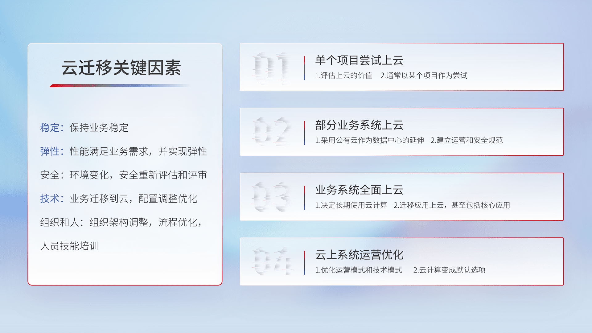 结合实际业务,,,从规划设计、、、、云平台选型、、、云原生改造、、、数据迁移、、、集成交付,,,迁移全过程为客户识别最佳上云路径,,,做好风险识别管理,,设计网络架构、、、身份权限、、、安全审计合规、、、操作审计、、、、日志审计、、监控告警策略、、、、多站点容灾设计等,,对云上基础设施进行整体规划,,,提升IT治理水平,,以满足弹性、、、、高可用、、、、高性能的需求。。。。