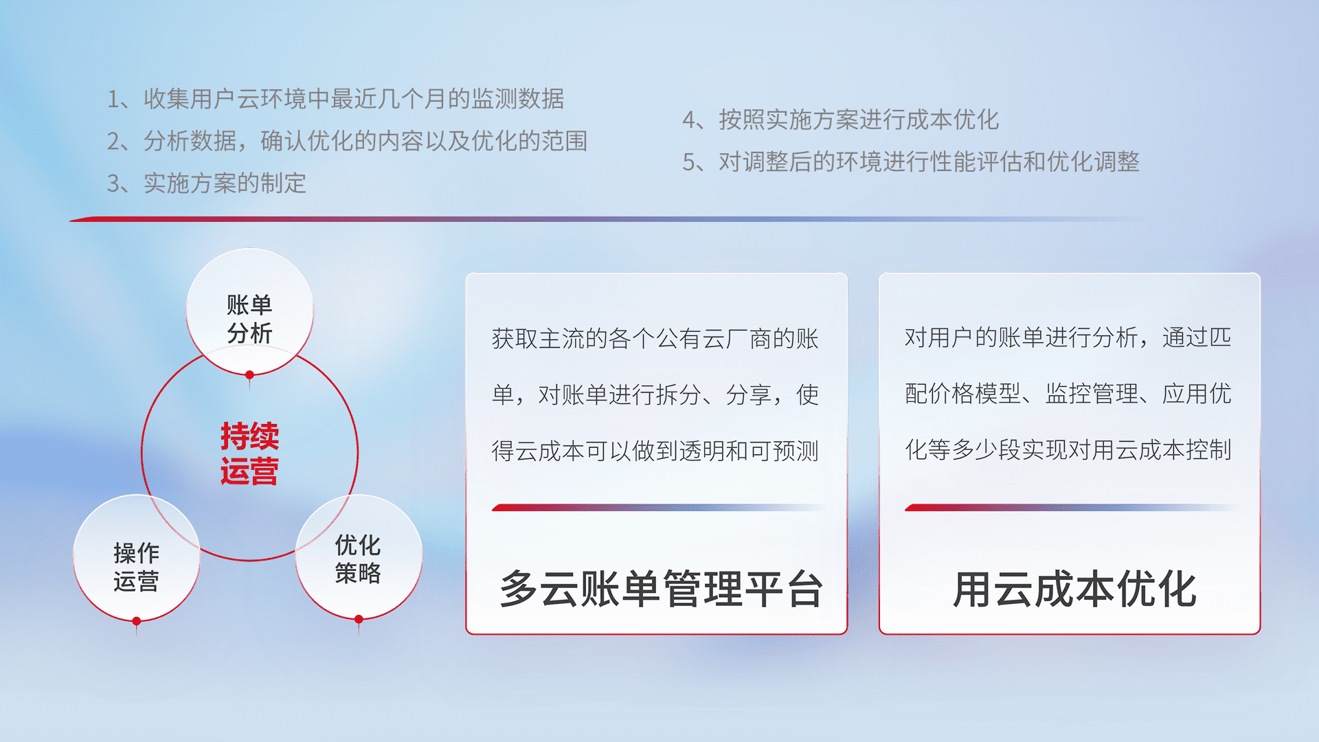 通过多云纳管,,,以统一的资源数据模型把客户的云资源进行抽象和封装,,,,进而实现对多云资源的统一操作,,,保障云资源管理的可靠性、、、稳定性与可用性。。。量身定制化运维内容,,,配置、、、、开发运维、、、、补丁管理、、备份、、、、监控、、认证和访问管理、、、、审计和日常巡检等,,,保障在用云过程中的可靠度,,,稳定度以及高可用率。。